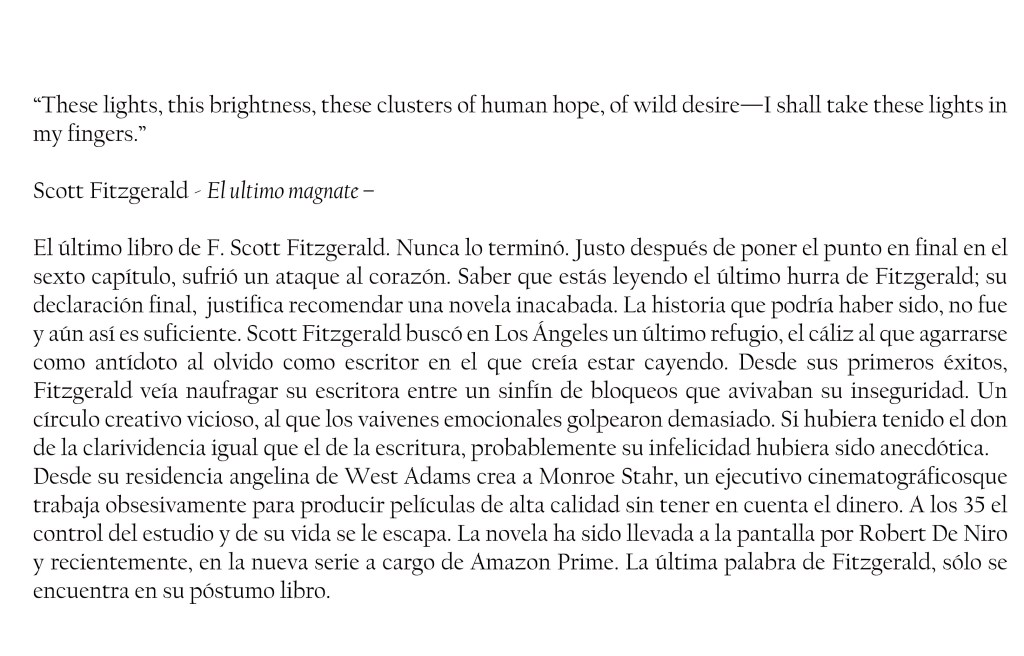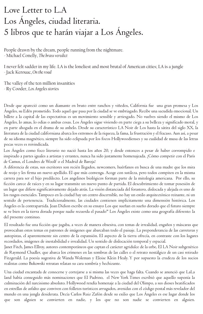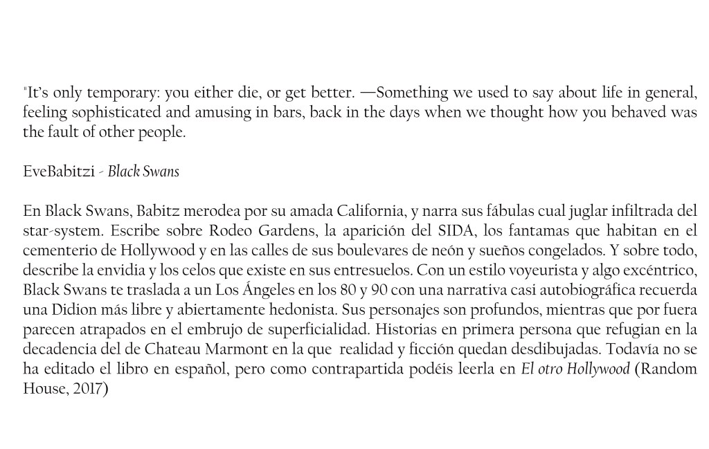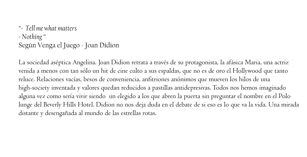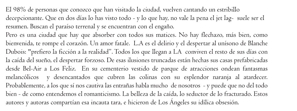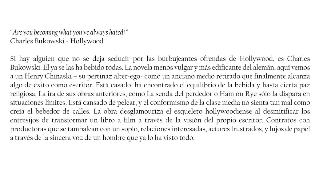it never reains in Southern California + Joan Didion (Random House, 2017)Glamourized deaths at Hollywood cementery &Charles Bukowski- Hollywood (Anagrama, 2007)En las fiestas de los Oscar también hay fantasmas + Eve Babitz – Black SwansLa piscina de Chateau Marmont + Francis Scott Fitzgerald – El último magnate (Navona, 2014)